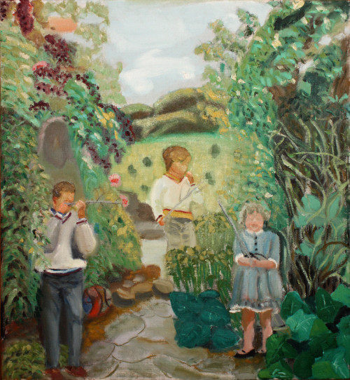 Image: Fran Herndon, Children and Grey Figure in a Garden, date unknown, oil on canvas, 68.58 x 63.5cm.