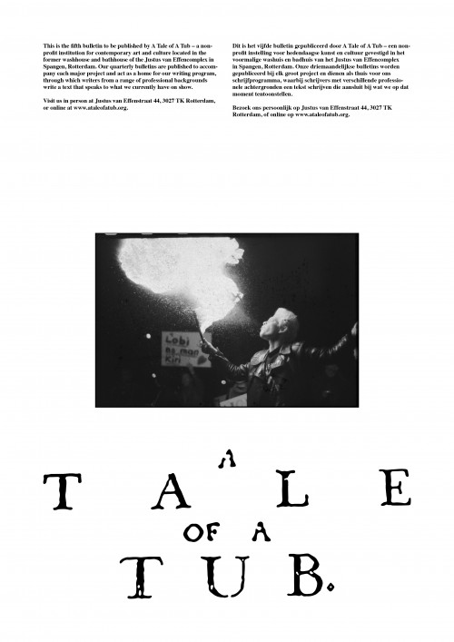 A Tale of A Tub brengt geregeld publicaties uit als onderdeel van ons tentoonstellingsprogramma en in het verlengde van ons onderzoek. Nieuw hierbij zijn onze bulletins die eens per kwartaal uitkomen bij elk groot project. De bulletins zijn een vehikel voor ons bijbehorende schrijfprogramma, waarbij schrijvers met verschillende professionele achtergronden worden uitgenodigd om voor elk project de tentoonstellingstekst te schrijven—beschreven vanuit hun eigen onderzoek en ervaring, in plaats van als directe reflectie of uitleg van het betreffende project. Onze bulletins zijn gratis en worden per post in de omliggende buurt verspreid en zijn verkrijgbaar bij ons in de ruimte, waardoor ze zowel dienen als manier om elkaar te ontmoeten en als een vernieuwde vorm van de standaard tentoonstellingstekst.