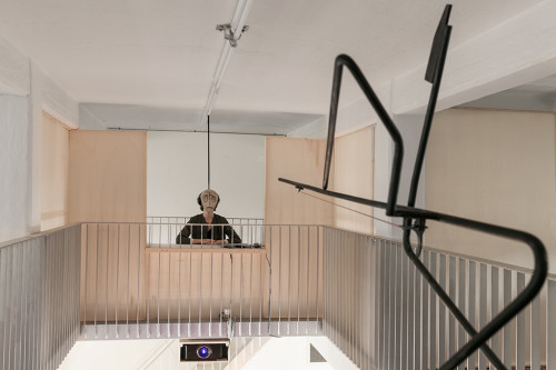 Voor de tentoonstelling Running out of History transformeert Michal Helfman A Tale of A Tub tot een hybride ruimte die zowel aan een kleurrijk theater als aan een clandestiene achterkamer doet denken. Helfman gebruikt het concept van deze theatrale frontpodium/achterzaalstructuur om te laten zien hoe geopenbaarde en verborgen krachten tegelijkertijd aan het werk zijn in onze maatschappij. Afhankelijk van waar je je in deze structuur bevindt, verschuift je positie voortdurend—van waarnemer naar de waargenomen persoon, van agressor naar danser, van smokkelaar naar kunstenaar. Het theater is immers een plek waar rollen gemakkelijk worden omgedraaid, waar niets is wat het lijkt en waar de realiteit en het symbolische samenvallen. Door middel van abstracte dans, technologie en theater vestigt Helfman onze aandacht op urgente politieke kwesties van rechtvaardigheid, collectieve verantwoordelijkheid, solidariteit en de mogelijkheid van alternatieve perspectieven op onze wereldgeschiedenis. De tentoonstelling test de relatie tussen oost en west, agressor en slachtoffer, smokkelaar en kunstenaar, en verkent manieren waarop het artistieke discours verder kan gaan dan de clichés van historische verhalen.